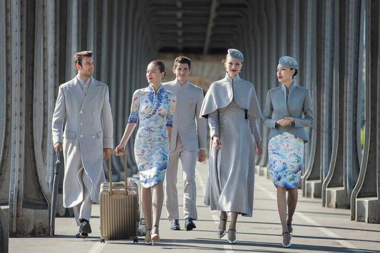 Terinspirasi oleh cheongsam, pakaian tradisional China, seragam pramugari dan pramugara ini merupakan kombinasi antara gaya modern Barat dengan elemen-elemen seni tradisional China, seperti lukisan awan, ombak, dan juga burung mistik Roc.